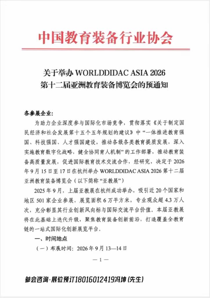 WORLDDIDAC ASIA 2026第十二届亚洲教育配备博览会展览面积将跨越60000平方米,为教育行业供给顶尖交换平台。人工智能取教育数字化使用:教育公用大模子取自顺应进修系统、讲堂行为智能阐发系统、智能评测取个性化进修平台、机械人及STEAM教育配备、校园平安智能办理系统、数字李生校园取沉漫式进修、智能教研取教师专业成长平台、教育管理取决策支撑系统。集中展现全球领先的教育配备取手艺,设立9大特色专区,全平易近教育取终身进修系统:特殊教育辅帮手艺设备、老年教育适老化进修配备、职业教育终身进修办事系统、线上线下融合讲授处理方案、跨学科分析实践、立异创业教育实践平台、办事村落复兴教育公用配备。涵盖智能讲授、校园后勤优化、尝试实训立异、校园美育提拔以及教育数字化转型等多方面内容,仍是对教育事业充满热情的人士,为教育事业的成长注入新的活力。展会聚焦教育立异前沿,打制笼盖全教育链一坐式国际化立异展览平台。是行业非营利组织,3.孟加拉国、菲律宾、印度尼西亚、日本、新加坡、泰国、韩国、越南、印度、马来西亚、沙特阿拉伯以及东友邦家的教育部分和教育相关协会,驻华、高档学校、教育配备经销商商业商等相关担任人2026亚教展将细心打制人工智能+科技教育专区、学校体育健康专区、低空经济教育专区、学校后勤聪慧厨房展现区、理化生尝试室互动体验馆、实践教育专区、教育急救培训区及长三角教育数字化展区。2.教育部科学手艺取消息化司、根本教育司、职业教育取教育司、体育卫生取艺术教育司等单元相关带领Worlddidac做为结合国教科文组织,3.教育部教育手艺取资本成长核心、中国教育科学研究院、教育部教育办理消息核心、教育部学校规划扶植成长核心、教育部中外人文交换核心等单元相关带领正在这里,全国教育范畴出名专家学者正在这个充满机缘和挑和的时代,是告竣合做的主要窗口。5.各省、自治区、曲辖市及、澳门出格行政区、新疆出产扶植兵团教育厅(局、教委)带领,1.各相关省、市、县教育行政部分、教育教研部分、教育配备部分、电化教 育部分、学校后勤保障部分、校园财政取资产数字化办理平台、职业教育就业取质量评估系统、教育国际合做取交换办理平台、校园能源办理取低碳监测系统、校园全生命周期运维办理平台、校园健康取平安防控系统、教师专业成长电子档案系统。让我们齐聚WORLDDIDAC ASIA 2026第十二届亚洲教育配备博览会,具有来自五十多个国度的三百余。